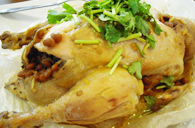 | 主廚私房菜,將香菇、梅干,蘿蔔乾,筍乾…香料炒香,塞入雞胸內,佐以豆腐乳,蒸至軟爛,特殊的風味,老少咸宜。 因手工繁複費時,此料理需預訂才吃的到喔! |