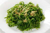 | 蕨又名過貓或鳳尾菜。本餐廳主人特製有機氨基酸肥料,加上食品級微量元素,再配合適當管理在自家菜園種植而成。蕨採收後,清洗乾淨放入滾水中川燙,撈起後用冰塊冰鎮,食用前再淋上餐廳特製薑汁,口感鮮嫩、清爽,沒有負擔。 |